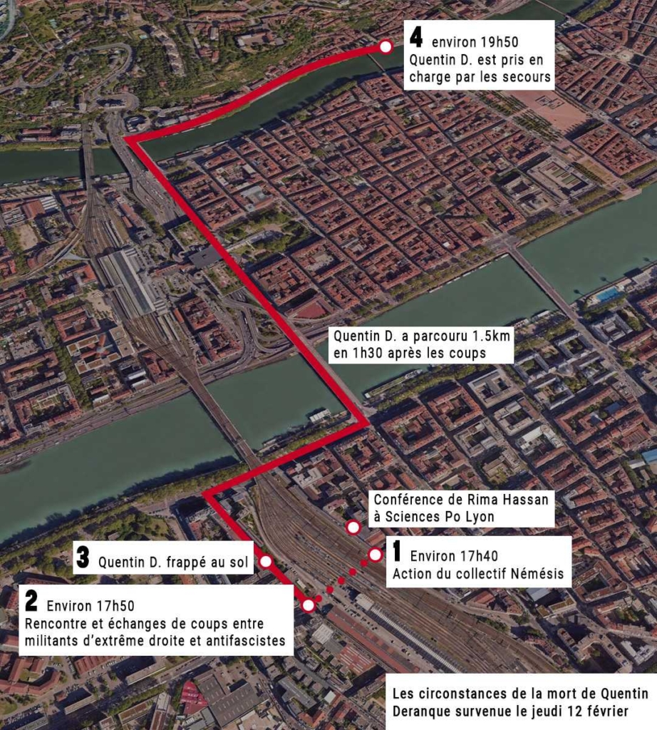 Maxime Sirvins : Il n’est pas possible pour le moment de savoir pourquoi Quentin Deranque ou ses camarades n’ont pas appelé les secours directement. D’après Franceinfo, des témoins « lui ont dit d’aller à l’hôpital » ce qu’il a « refusé ». Selon le procureur de la République, Thierry Dran, Quentin Deranque présentait « un traumatisme crânio-encéphalique majeur », avec des blessures « au-delà de toute ressource thérapeutique et mortelles à brève échéance ». Voici une carte qui retrace les points importants jusqu’à l’appel des pompiers de Quentin Deranque.
