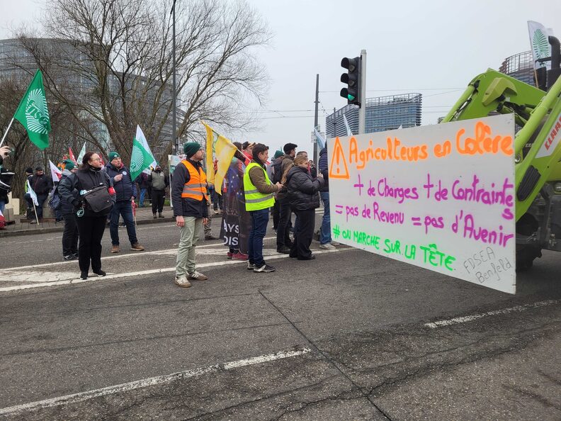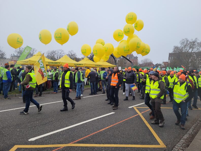 Dès 9h mardi matin, des agriculteurs français et européens se sont rassemblés place de Bordeaux à Strasbourg. À l’appel de leurs syndicats, principalement les syndicats productivistes FNSEA et Jeunes agriculteurs en France, ils se sont rendu en direction du Parlement européen. Plusieurs milliers de manifestants ont participé à cette démonstration du monde agricole, appuyée par environ 600 à 700 tracteurs qui doivent stationner dans les rues autour du bâtiment abritant l’hémicycle du parlement jusqu’à l’après-midi du mercredi 21 janvier.